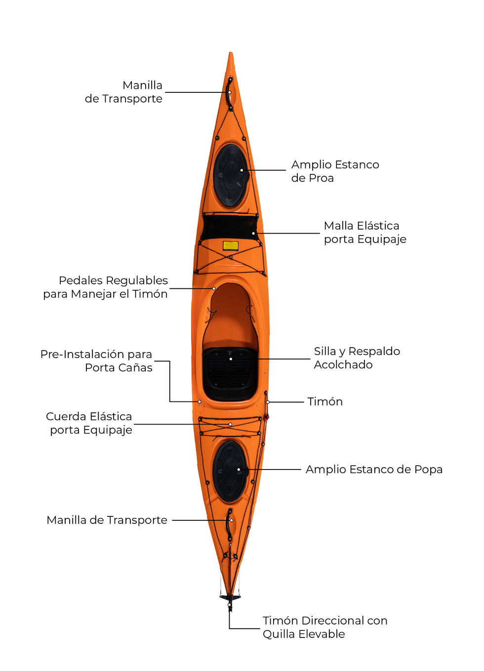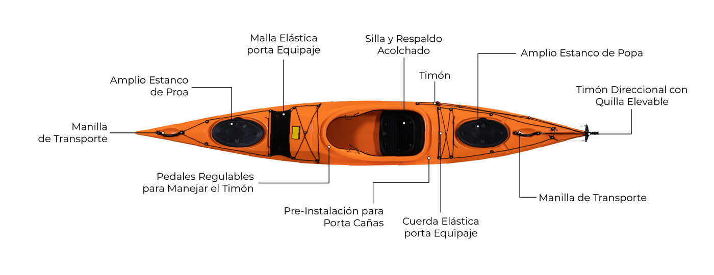 • Equipado con timón controlado por pedales, siendo estos regulables para adaptarse a todo tamaño de persona. Cuenta con escotillas y mallas elásticas para cargar todo el equipaje necesario.