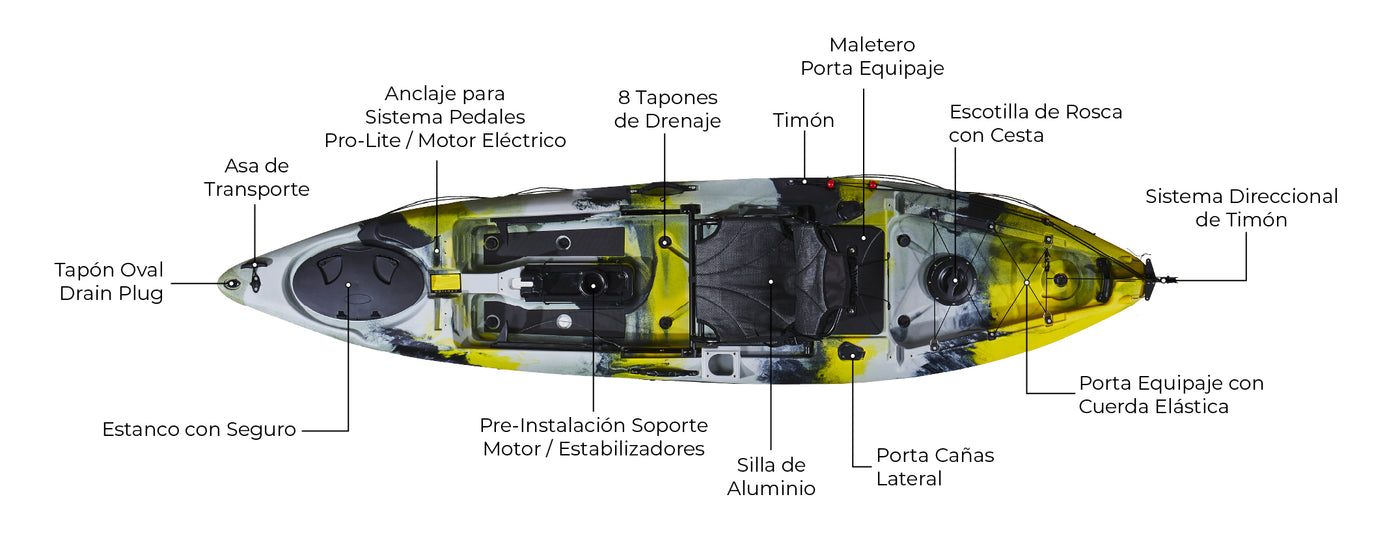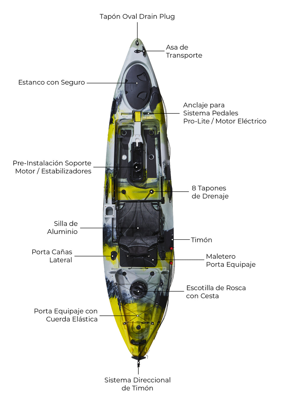 • El Mirage Pro Angler 12 Propel 12 viene equipado para utilizarse con remos, pero incluye en el diseño del casco un hueco para instalar la Pedalera de Helice Pro-Lite, para ser usado como kayak a pedales, o bien, se puede montar un motor eléctrico a batería.