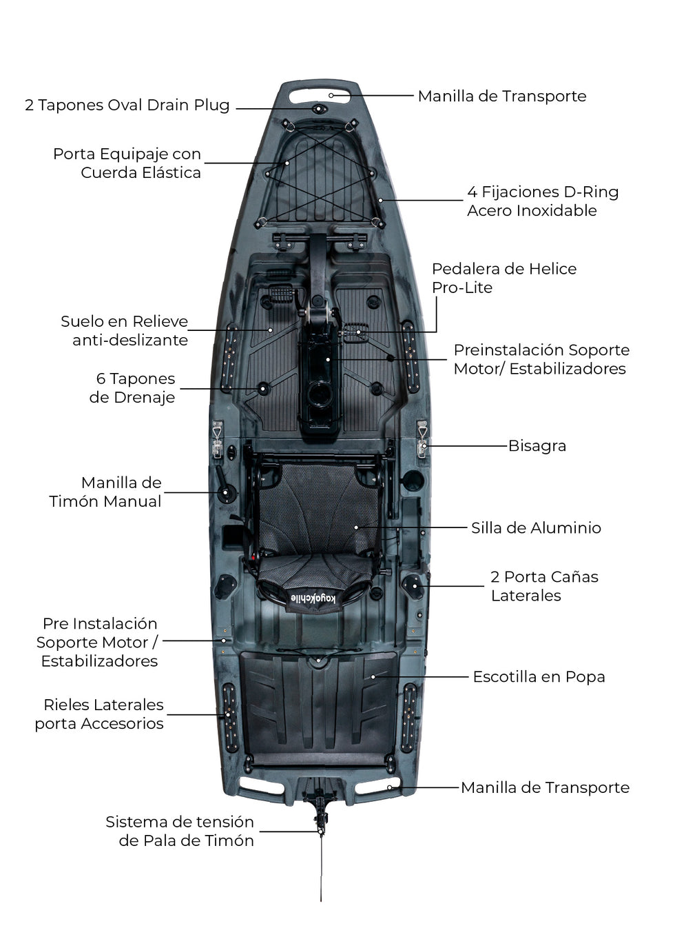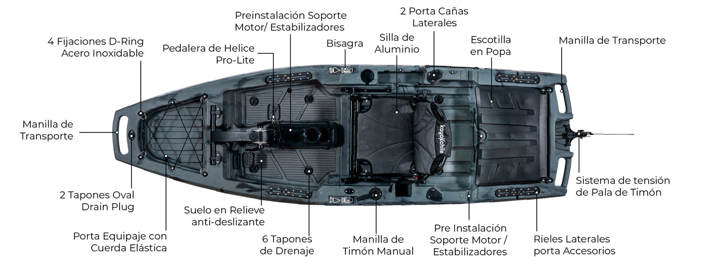 Diseñado para los amantes de la pesca, este kayak de 280 cm. combina estabilidad, rendimiento y comodidad. Fabricado en polietileno de alta densidad (LLDPE) rotomoldeado de 4 mm, garantiza durabilidad y resistencia en cada salida. Su diseño modular y desmontable facilita el transporte y almacenamiento, adaptándose a tu estilo de vida. ¡Explora, pesca y disfruta con la mejor experiencia en el agua!"